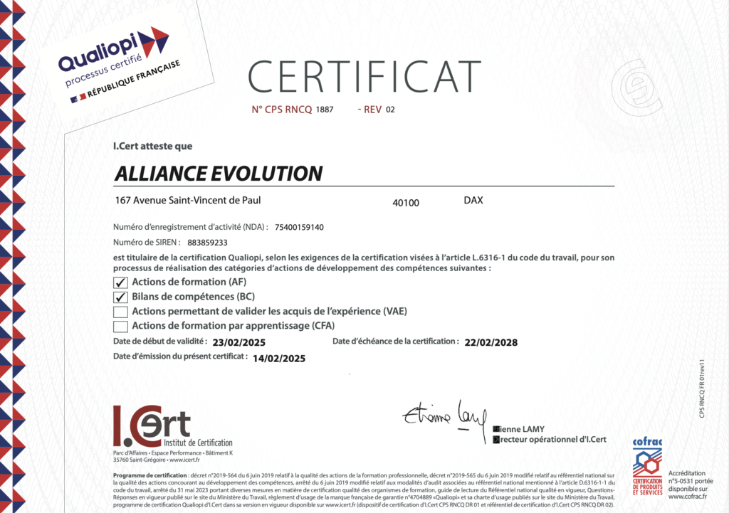 – Notre certification Qualiopi qui justifie d’un process qualité mis en place dans notre structure